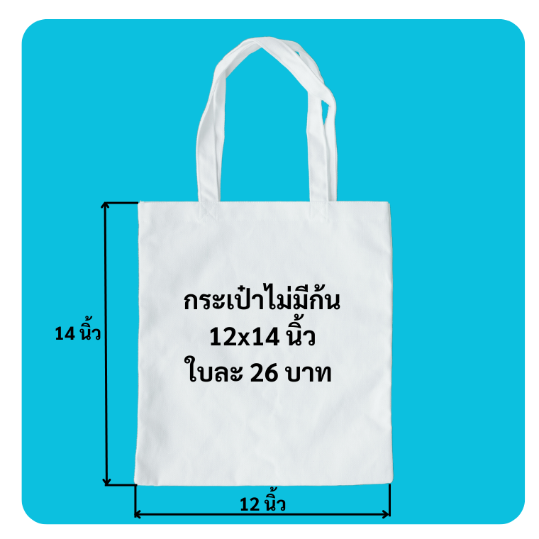 รับทำสินค้ากระเป๋าผ้าดิบ สำหรับแจกในโอกาสต่าง ๆ ทุกแบบทุกขนาด ด้วยผ้าดิบแคนวาส สำหรับใช้งานในงานต่าง ๆ ผลิตด้วยผ้าดิบคุณภาพ เนื้อผ้าหนา แข็งแรง ใช้งานได้นาน พร้อมทั้งสามารถสกรีนสี ได้ไม่จำกัด ไม่ต้องทำบล็อคสกรีน ไม่ต้องจ่ายค่าทำบล็อค ตัวอย่างกระเป๋าผ้าขนาด 12x14 นิ้ว กระเป๋าเปล่าใบละ 26 บาท เพิ่มสกรีนใบละ 10 บาท รวมเป็นใบละ 36 บาท
