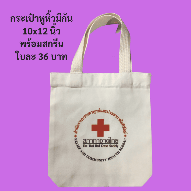 รับสกรีนกระเป๋าผ้าดิบ สกรีนถุงผ้าดิบแคนวาส ไม่จำกัดสี ไม่ต้องทำบล็อกสกรีน ด้วยเทคโนโลยี Heat Transfer สกรีนแบบรีดร้อน สีแห้งติดทนนาน ตัวอย่างกระเป๋าขนาด 10x12 นิ้ว พร้อมสกรีน ราคาใบละ 36 บาทเท่านั้น กระเป๋าผ้าขนาดใหญ่ สามารถใส่สมุด หนังสือ อุปกรณ์การเรียน โบรชัวร์ หรือใส่ของใช้อื่น ๆ ได้